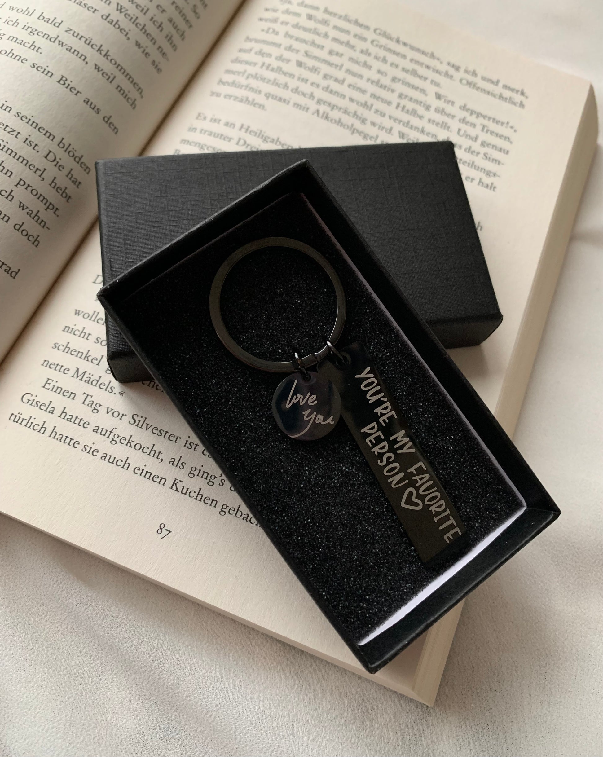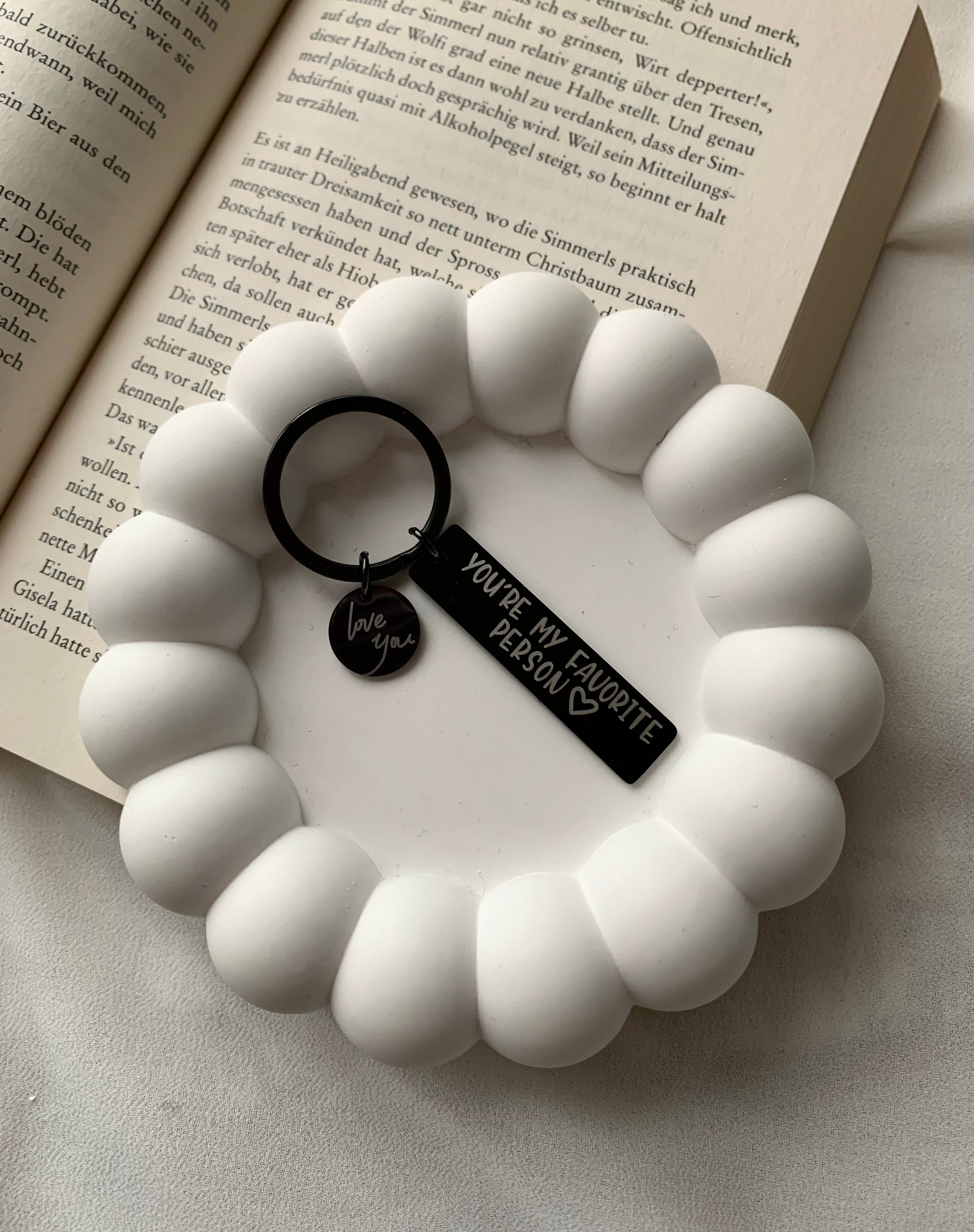 Schlichter, schwarzer Schlüsselanhänger mit der Aufschrift "You‘re my favorite person“