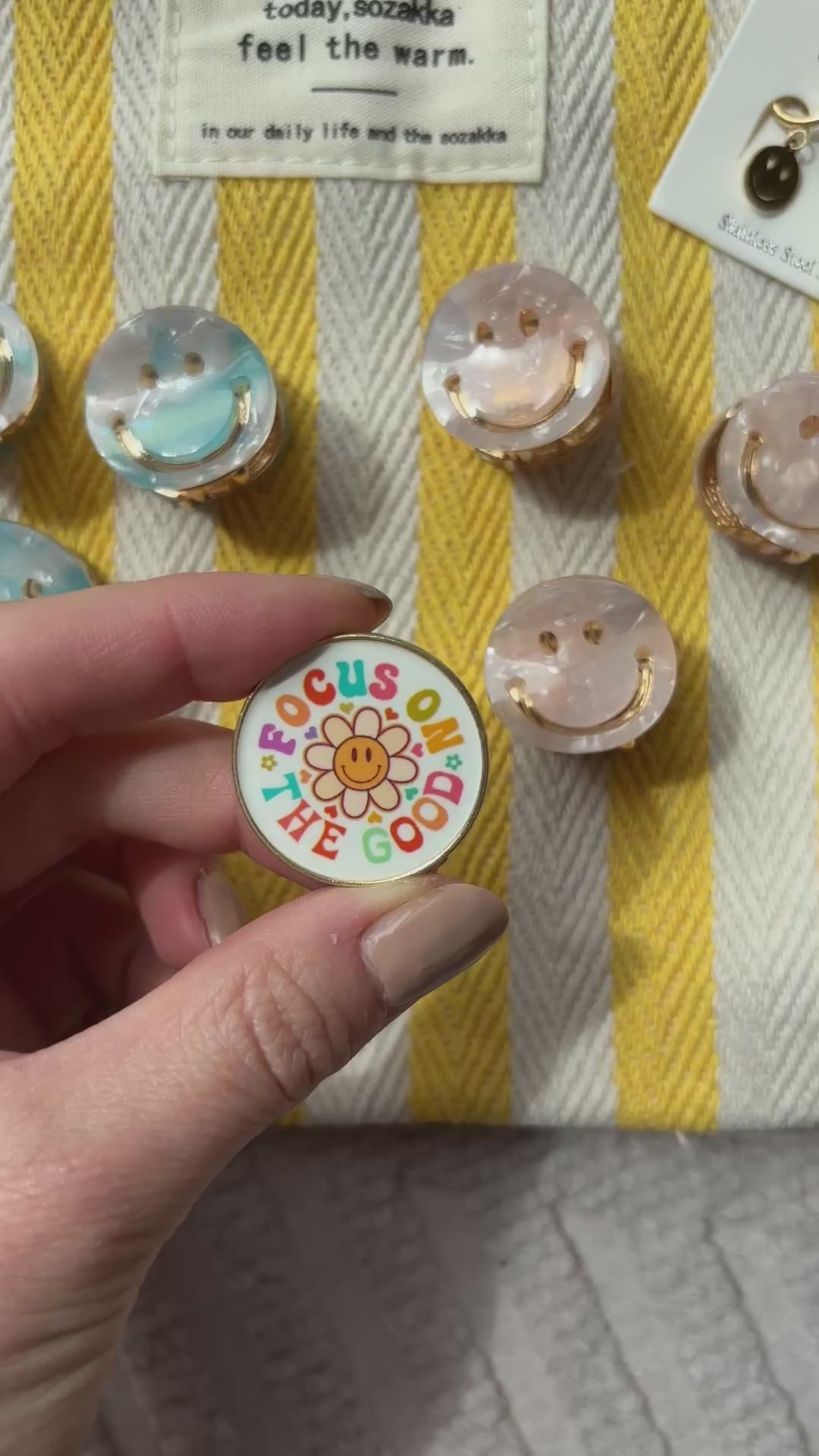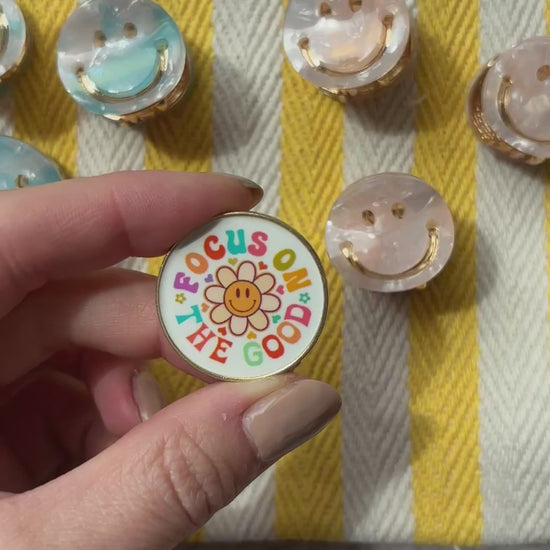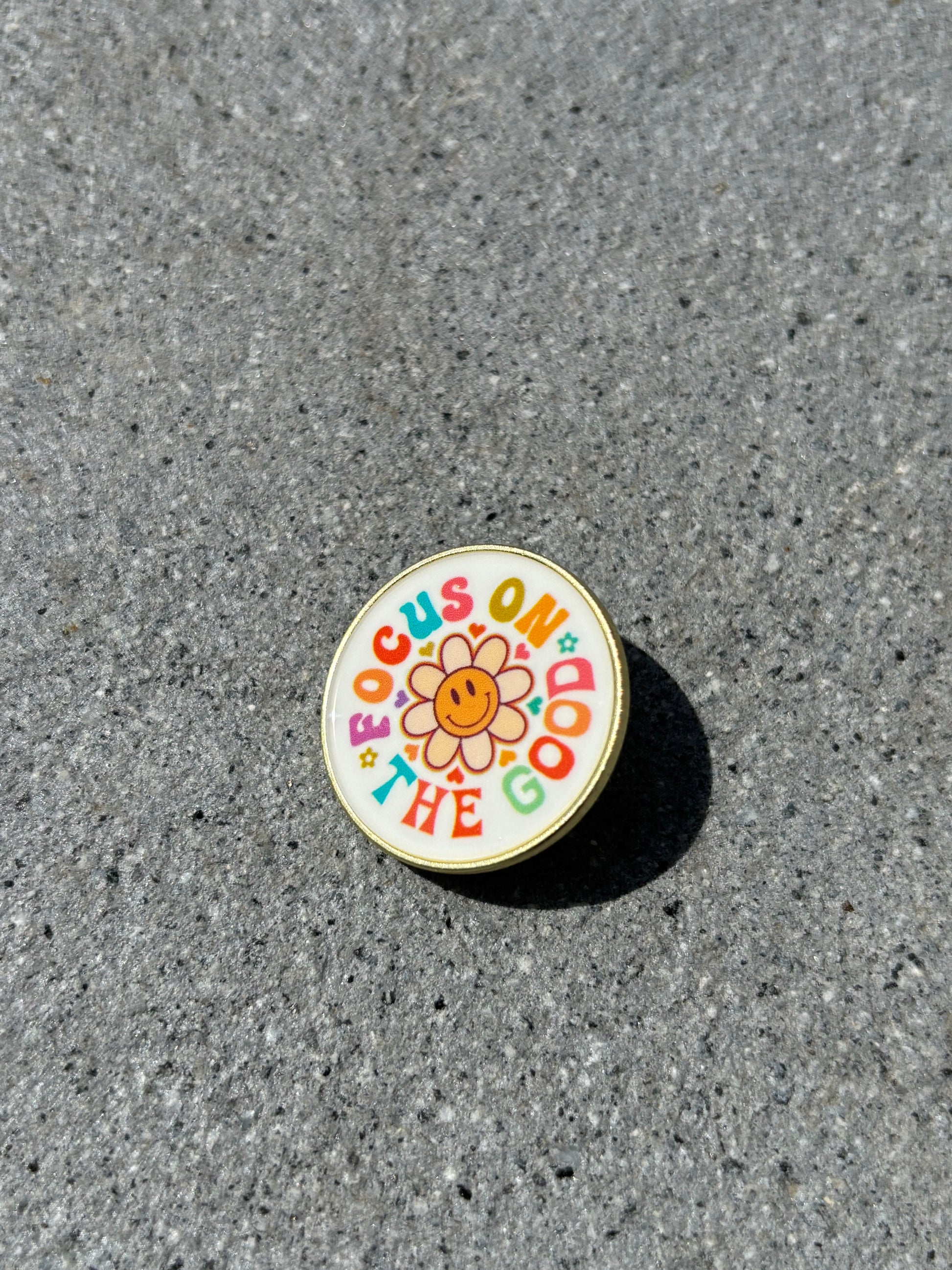 Setzen Sie mit unserem einzigartigen, bunten goldenen Anstecker ein mutiges Statement und verbreiten Sie positive Vibes! Der Anstecker zeigt den inspirierenden Spruch "Focus on the Good", der Sie und andere daran erinnert, die positiven Dinge im Leben zu schätzen.