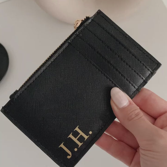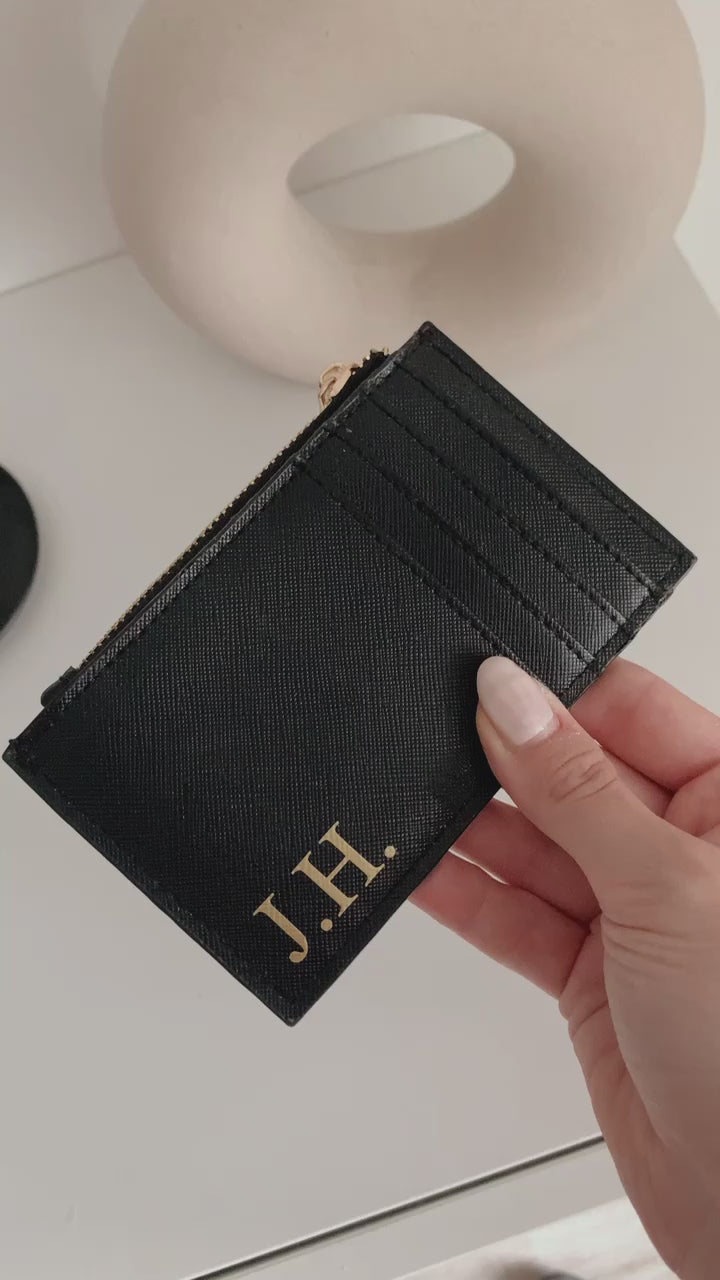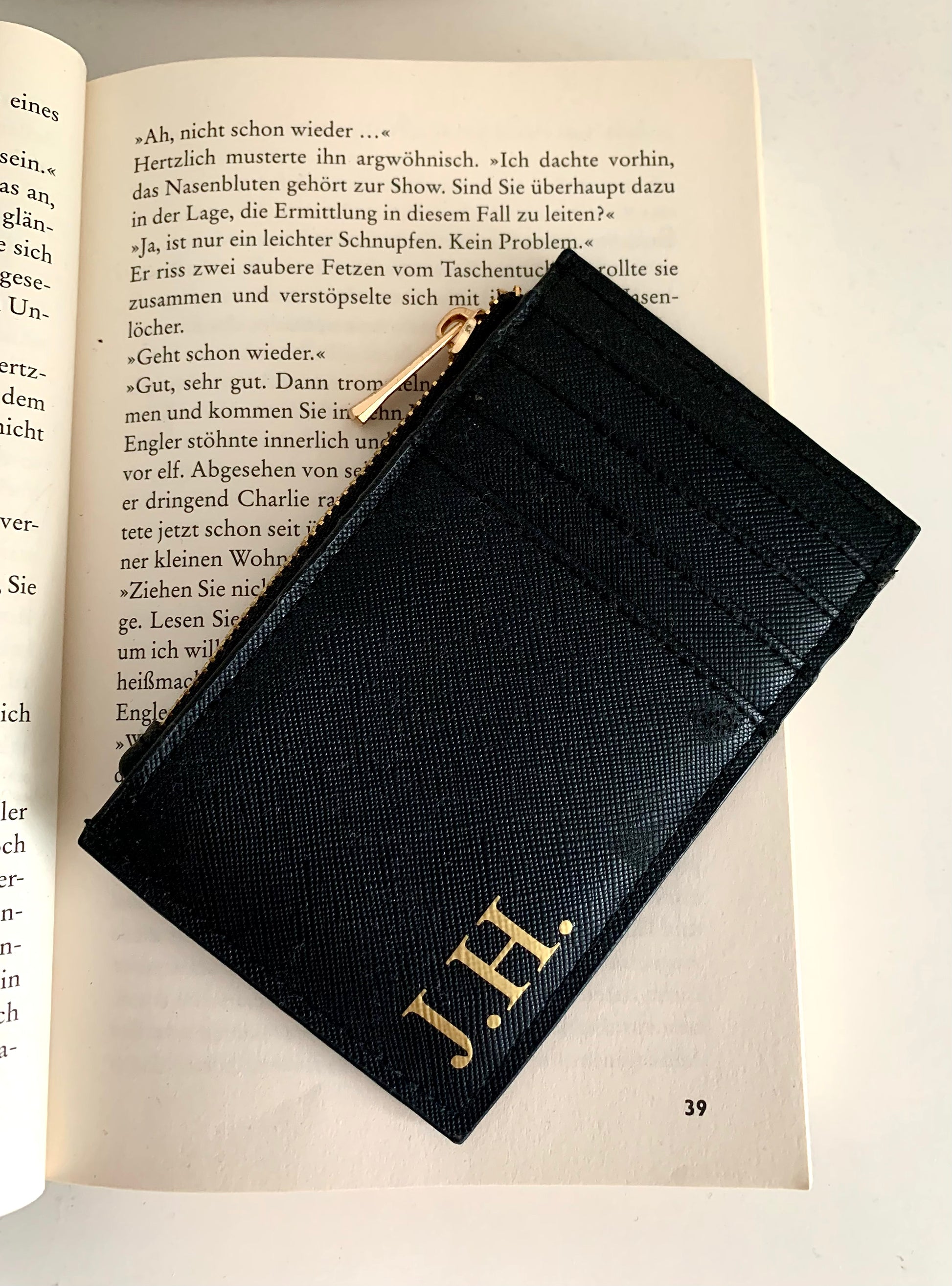 Kleiner, flacher Geldbeutel mit deinem Name oder deinen Initialen auf der Vorderseite.